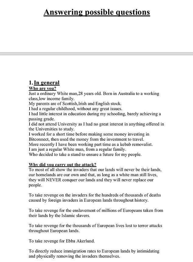 В своем манифесте, который опубликовавшая его Daily Mail, называет бессвязным, Брентон Таррант пишет о себе, как «простом белом мужчине, 28 лет. Который Родился в Австралии в рабочей семье с низким доходом. Мои родители шотландского, ирландского и английского происхождения. У меня было обычное детство, без особых проблем. Он не скрывает, что плохо учился и едва получил аттестат, а также никогда не посещал университет. Свой поступок Таррант объясняет необходимостью привлечь внимание людей к так называемому «геноциду белых»: замещению людей европейского происхождения другими народами из-за низкой рождаемости среди белых и массовой иммиграции. Кроме того, Таррант, не скрывает того, что одной из главных целей теракта – вызвать ответное насилие против белых со стороны мусульман как месть за произошедшее. «Моя цель – побудить к насилию», подчеркивает террорист.