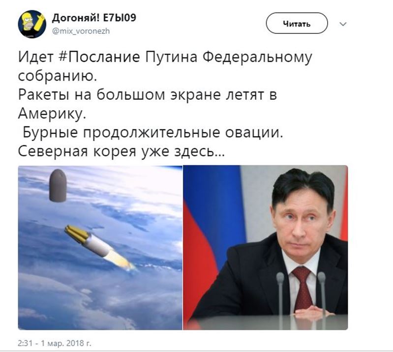 «Я не знаю, что там у нас с экономикой, здравоохранением и образованием, но те виды оружия, которые презентовал на выступлении Владимир Путин даст пистюлей всему миру сразу. Это или блеф или фантастика. Пусть выскажутся специалисты…. Путин абсолютно не удивил в первой части, но вот во второй мы видимо сегодня поставили весь мир рхаком….