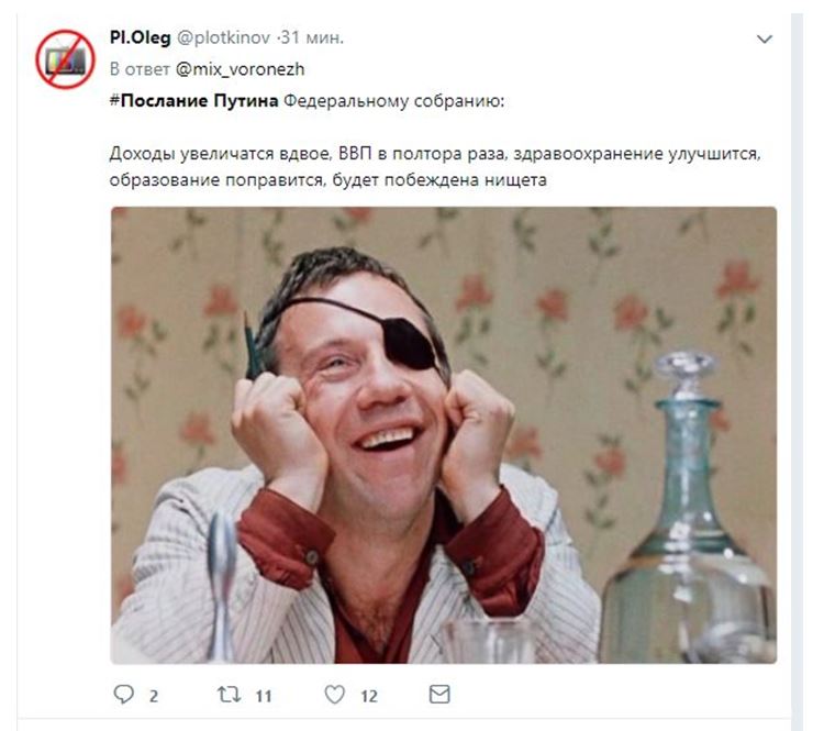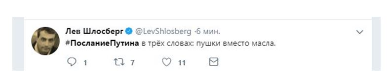 «Слушаю Путина и понимаю, что весь его доклад написан для малообразованных людей, которые ничего не понимают и не хотят понимать. Весь доклад для быдла! #Послание».