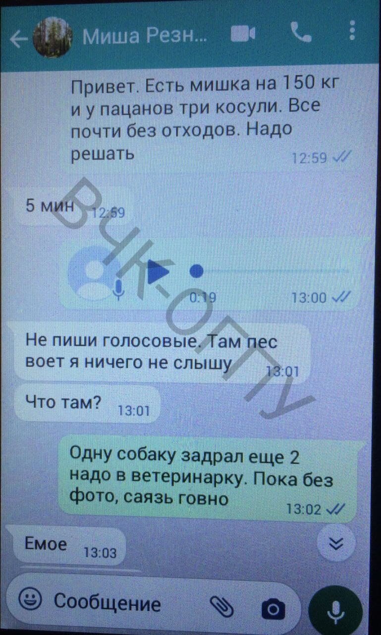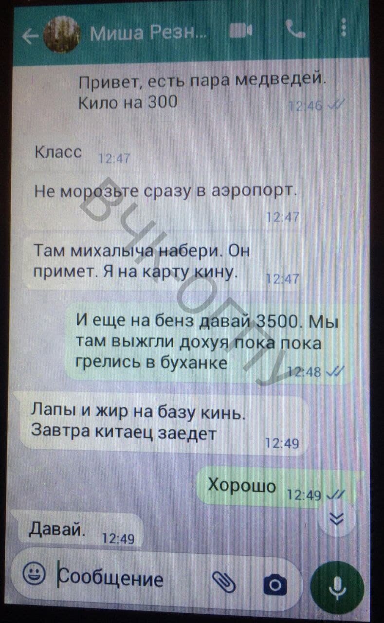 Причина этого оказалась скрыта в мобильных телефонах браконьеров. Из их переписки, которая есть в распоряжении ВЧК-ОГПУ, следовало, что браконьерское убийство медведей и других животных было для них бизнесом. Более того, обычно они работали по заказам, поступающим из Москвы. Мясо медведей, оленей, косуль они отправляли за деньги специальными самолетами в столицу для ряда крутых ресторанов. А дальше самое интересное.
