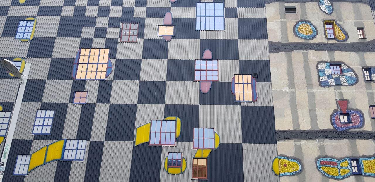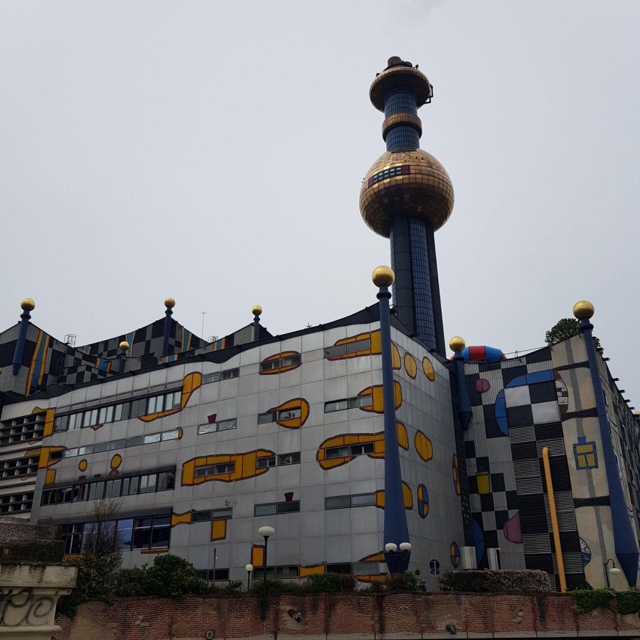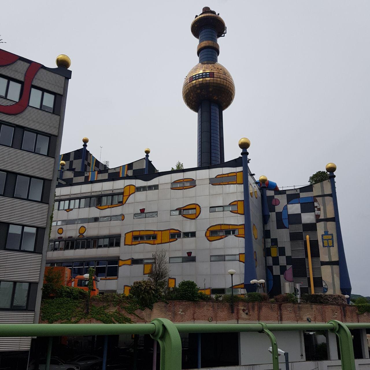 Это — мусоросжигательный завод Шпиттелау, а такой необычный, потому что после пожара в конце 80-х его переделывал знаменитый архитектор Хундертвассер.
