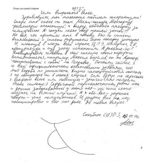 «Если вдруг на пересылке я вскрою вены, или повешусь, значит мне помогли. Очень сильно», — писал Тесак.