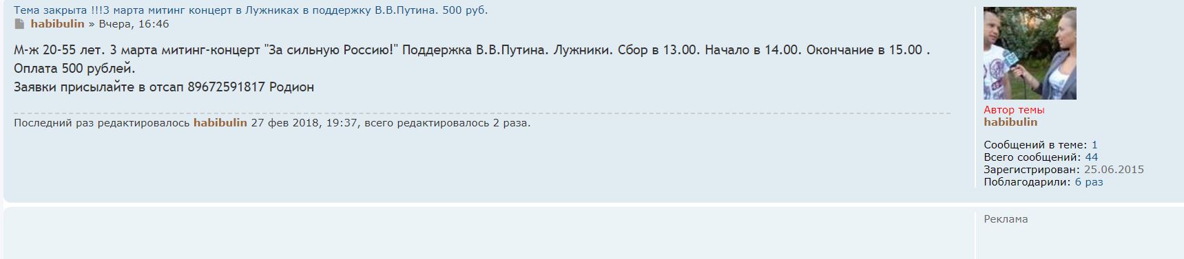В тексте объявления до сведения всех желающих доводится, что для принятия участия в акции «За сильную Россию» на платной основе, требуются представители обоих полов в возрастной категории 20 – 55 лет. Сбор людей состоится в 13:00 уже в эту субботу — 3.03.2018 года, а концерт начнется в 14:00 и будет продолжаться до 15:00. Всем кто согласен на условия, пообещали выплатить по ₽500. Под объявлением пользователи оставляют свои личные данные с информацией как с ними связаться для участия в акции.