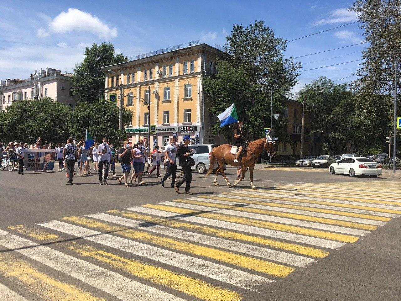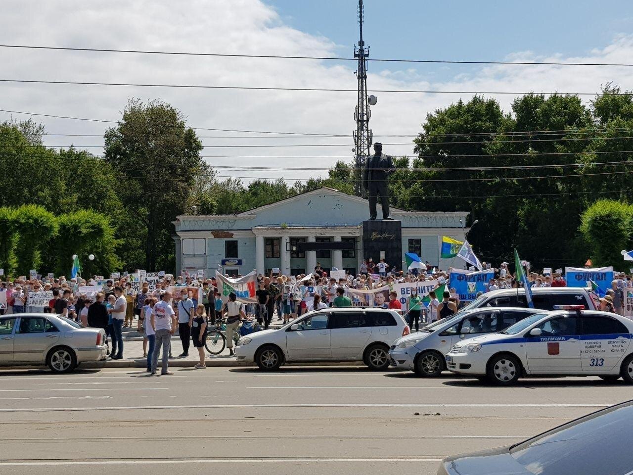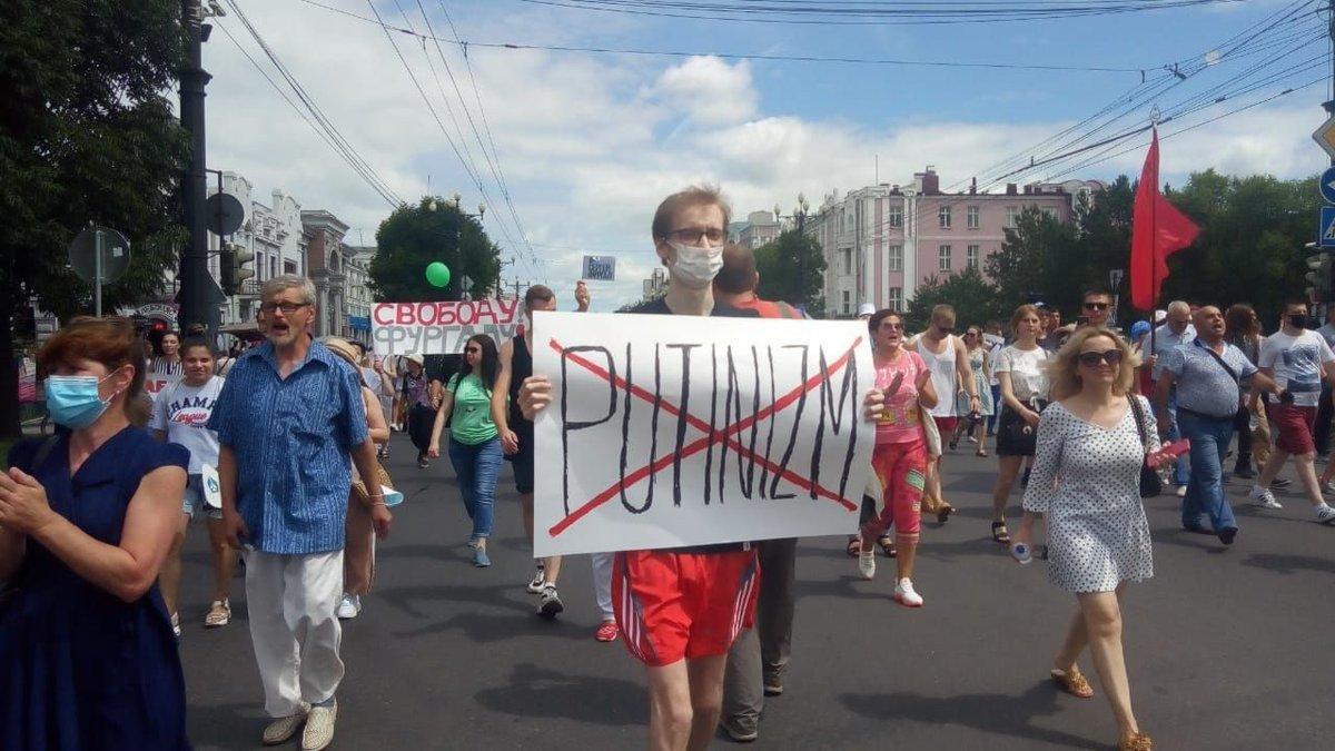 В субботу, 25 июля рекордное количество жителей Хабаровска вышли на очередной несанкционированный властями протест в защиту арестованного губернатора Сергея Фургала и произвола московских властей. По разным оценкам в только в Хабаровске в акции протеста приняли участие от 75 000 до 120000 жителей. Почти 5-я часть жителей города вышла на улицы. Кроме того, беспрецедентное количество акций солидарности прошло сегодня в разных городах страны. В их числе: Комсомольск-на-Амуре, Краснодар, Екатеринбург, Владивосток, Иркутск, Новосибирск, Омск, Санкт-Петербург, Ростов-на-Дону, Южно-Сахалинск, Чита, Якутск, Благовещенск, Северодвинск, Сургут, Москва.