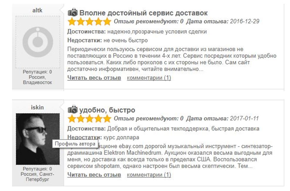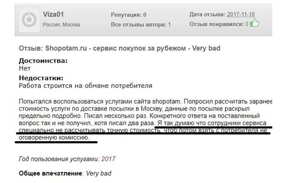 Анализируя качество работы ShopoTam, мы заметили, что о традиционной для «Бандерольки» и «Шипито» тенденции ухудшения уровня сервиса со временем здесь говорить не приходится. Нет и явных недостатков, на которые пользователи оставляли бы массовые жалобы. Отрицательные отзывы есть, но они «размытые», неконкретные и носят скорее индивидуальный характер. К достоинствам организации следует отнести ее «почтенный» возраст – более 10-ти лет на рынке, сотрудничество с огромным количеством магазинов по всему миру, большой выбор способов оплаты, услугу Mail Forwarding, позволяющую клиенту самостоятельно выкупить товар у продавца, а затем отправить его на склад «Шопотам» для дальнейшей доставки итоговому получателю.