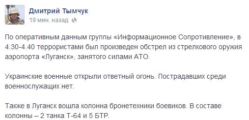 Это же подтверждает в своем Facebook Дмитрий Тымчук, руководитель группы «Информационное Сопротивление».
