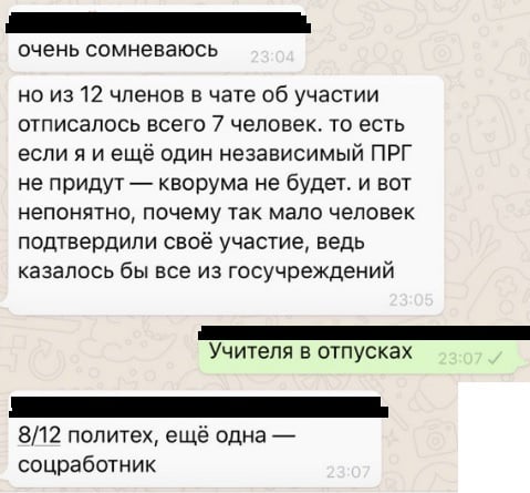 «но из 12 членов в чате об участии отписалось всего 7 человек. то есть если я и ещё один независимый ПРГ не придут — кворума не будет. и вот непонятно, почему так мало человек подтвердили своё участие, ведь казалось бы все из госучреждений»