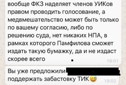 «Вообще ФКЗ наделяет членов УИКов правом проводить голосование, а медвмешательство может быть только по вашему согласию, либо по решению суда, нет никаких НПА, в рамках которого Памфилова сможет издать такую бумажку, да и не издаст скорее всего»