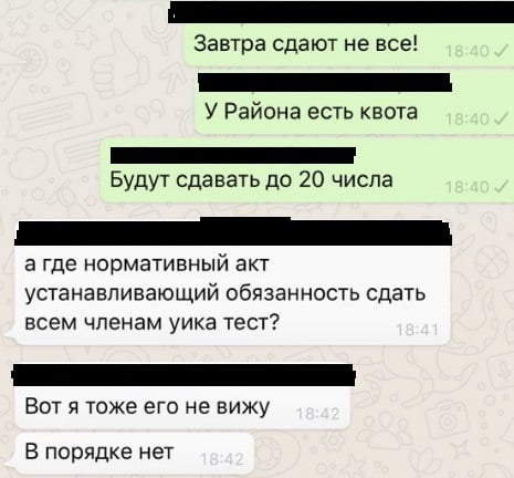 «Секретарь ТИК в приказном порядке обязала всех членов моего УИК сдать анализ 11.06 в кинотеатре Моссовет. Сославшись на уваж.причину, я отказался. Мне позвонил один из руководства УИК.»