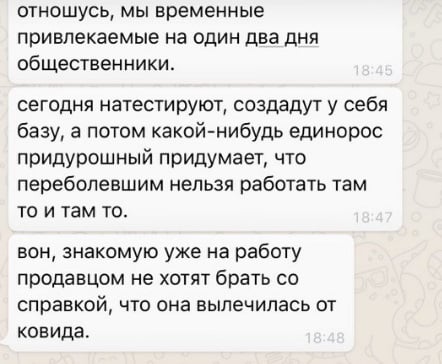 «сегодня натестируют, создадут у себя базу, а потом какой-нибудь единорос придурошный придумает, что переболевшим нельзя работать там то и там то»