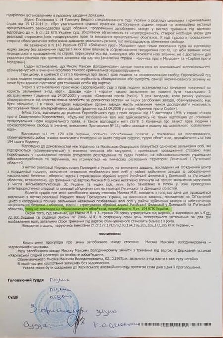 Пока что освобожденный обязуется не покидать Харьков без разрешения, сообщать прокурору или в суд о смене места своего жительства, немедленно являться по их первому требованию. Впрочем, раз речь идет об обмене между государствами, то это ненадолго – скоро новая родина Максима Мысяка прижмет его к своей необъятной груди.