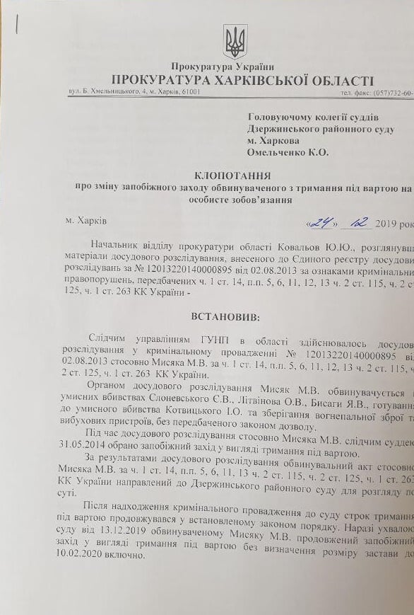 Мысяка обвиняется в трех убийствах – ему инкриминируют убийство бизнесмена Ярослава Бысаги в августе 2013 года, а также двойное убийство в марте 2014 года, жертвами которого стали предприниматель Евгений Слоневский и его знакомый Олег Литвинов. Кроме того, тот же будущий ценный российский гражданин уличен в незаконном хранении огнестрельного оружия и взрывных устройств, а еще подозревается в организации покушения на тогдашнего депутата Харьковского облсовета Игоря Котвицкого, случившегося в июне 2014 года.